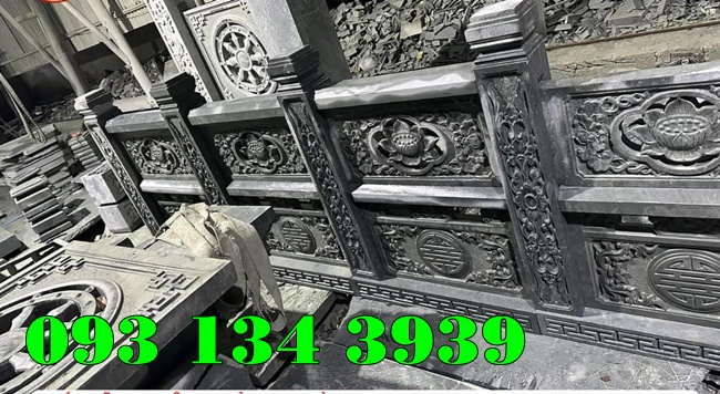 lan can đá xanh rêu đẹp điêu khắc hoa văn tứ quý, kèm chữ Phúc - Đá xanh đen: Chịu được nhiệt độ cao và chống rêu mốc. thích hợp cho các công trình tâm linh.